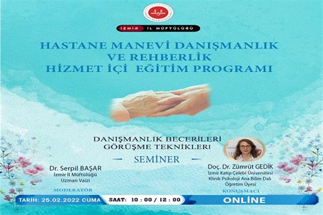 İlimiz geneli Hastane Manevi danışmanlık görevlilerine yönelik olarak gerçekleşen eğitim programında "Danışmanlık Becerileri" genel başlığı altında, İl Uzman Vaizi Dr. Serpil Başar' ın Moderatörlüğünde, İKÇÜ Sosyal ve Beşeri Bilimler Fakültesi Psikoloji Anabilim Dalı Öğretim üyesi Doç. Dr. Zümrüt Gedik tarafından 4 farklı konu işlendi.