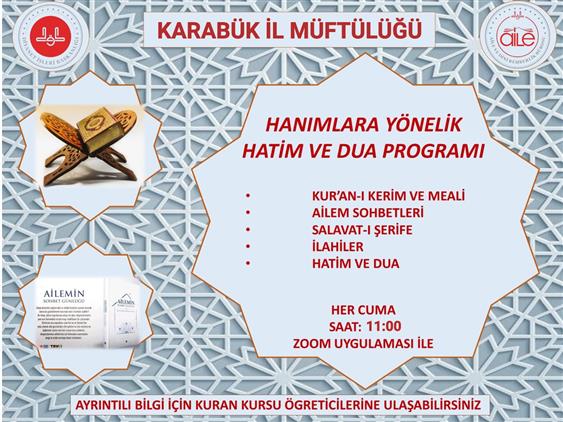 İl Müftülüğümüze bağlı Kur'an Kurslarımızda her hafta Cuma günleri İl Müftü Yardımcımız Merve YUMLU, İl Vaizlerimiz ve Kur'an Kursu Öğreticilerimiz tarafından Başkanlığımız yayınlarından "Ailemin Sohbet Günlüğü" Kitabından sohbet ve Dua Programları devam etmektedir.